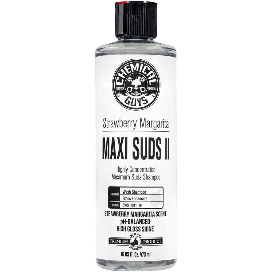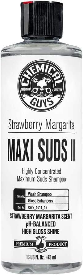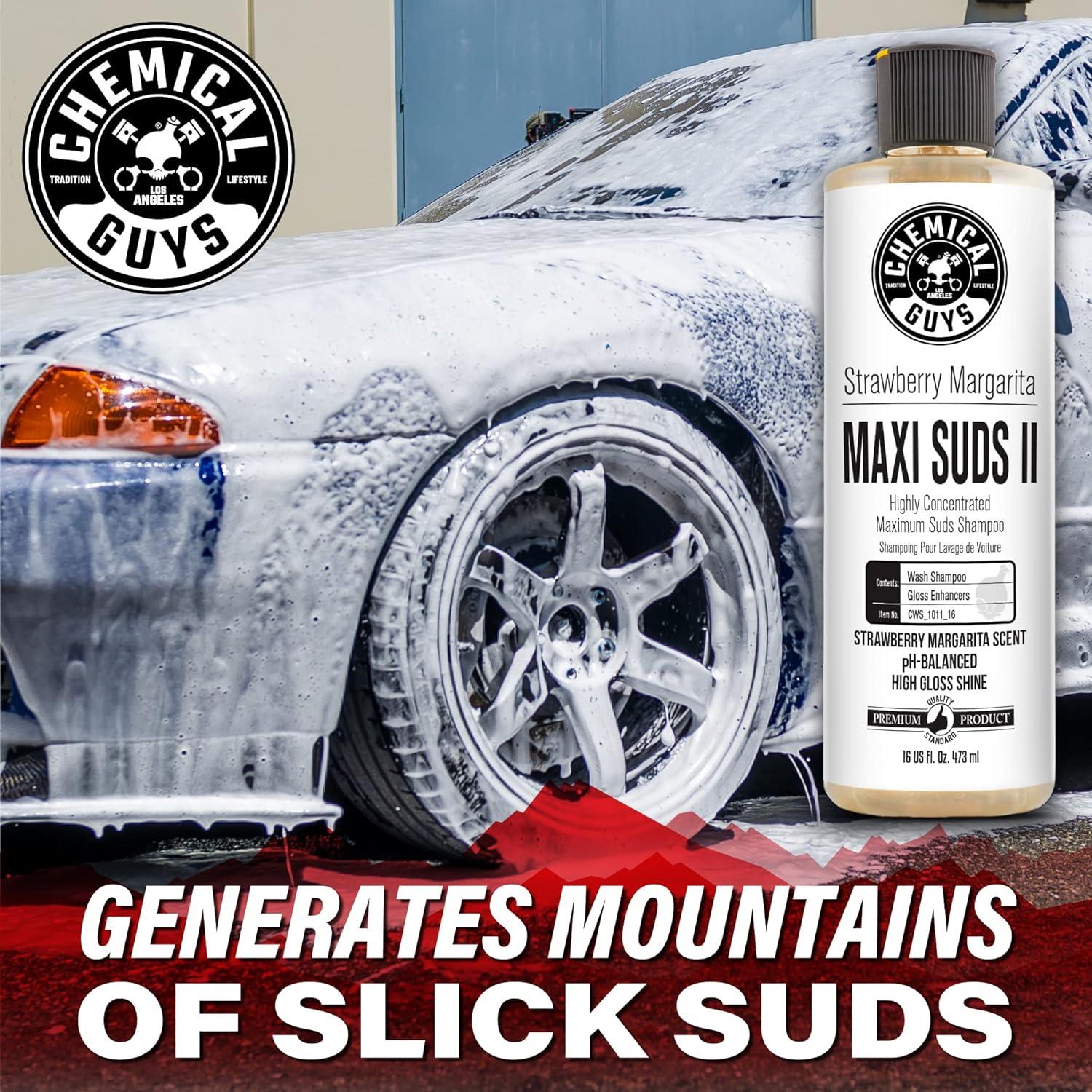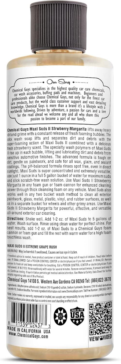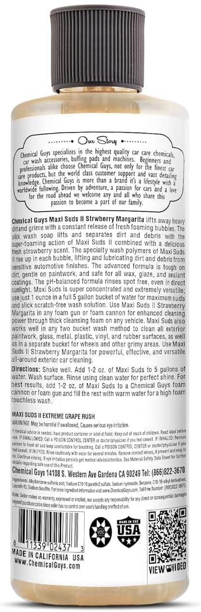 Maxi Suds II Strawberry Margarita Soap lifts away heavy dirt and grime with a constant release of fresh foaming bubbles. The slick wash soap lifts and separates dirt and debris with the super-foaming action of Maxi Suds II Strawberry Margarita Soap combined with a delicious fresh strawberry scent. The specialty wash polymers of Maxi Suds II rise up in each bubble, lifting and lubricating dirt and debris from sensitive automotive finishes. The advanced formula is tough on dirt, gentle on paintwork, and safe for all wax, glaze, and sealant coatings. The pH-balanced formula rinses spot free, even in direct sunlight. Use Maxi Suds II Strawberry Margarita in any foam gun or foam cannon for enhanced cleaning with thick foam on any vehicle.